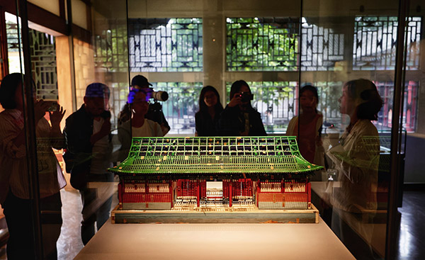 “见微知著”单元以燕寝、园居建筑为例,展现烫样、图档文物所记录的中国传统建筑精致的内檐装修和丰富的建筑外形,说明“烫样”作为核心依据之一,在清代皇家建筑“设计-审批-施工”过程中的重要作用。展出的故宫博物院藏圆明园九洲清晏殿、万方安和殿烫样,制作于清同治年间,是为重修圆明园供同治皇帝、慈禧太后等审看设计方案所做,详尽表现了建筑外形、数十槽室内装修乃至家具陈设等各项细节。一同展出的20件清华大学建筑学院中国营造学社纪念馆收藏的清样式雷内檐装修板片烫样,是该馆200多件同类藏品中第一次部分对外展示。它们有如九洲清晏殿这类大型烫样的“设计图库”,供决策者参考挑选,提出修改意见。另一件故宫博物院藏地安门烫样,做工精细,遍施彩色。展示时揭下了最上层的黄色琉璃瓦屋顶,露出结构精密的屋架结构,其上遍贴说明开间、面宽、柱高、柱径等信息的黄色签条,直观展现了烫样作为设计说明,在审批和后续施工中的作用。