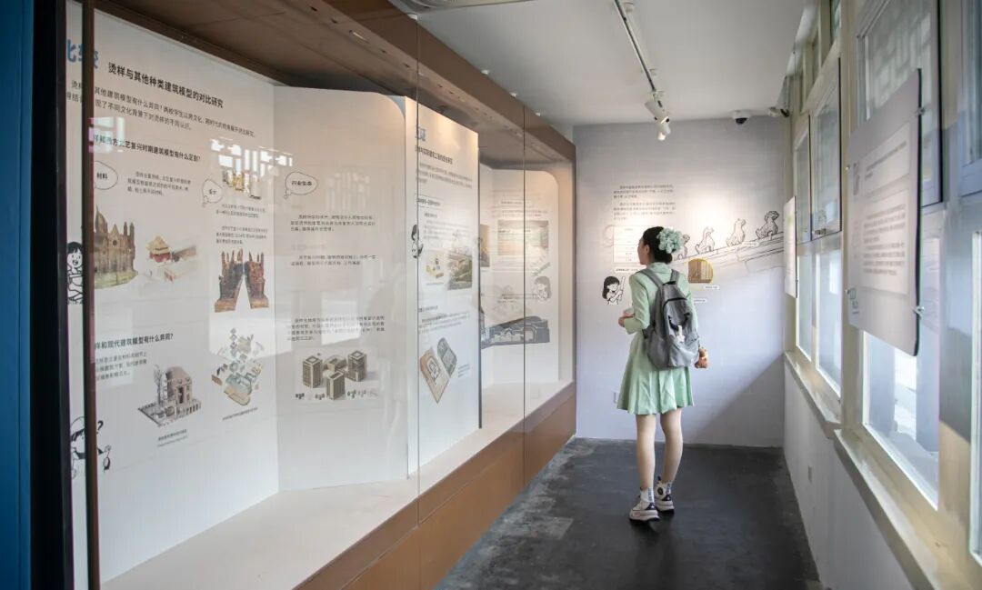 在呈现方式上,展览注重“纪实视角”与“科普传播”相结合。一方面,展出两校学生团队开展烫样专题研究和复原的现场照片、学生笔记、制作工具等“一手材料”,原真呈现课题研究过程和实践感悟;另一方面,注重学术成果的科普转化,运用中德师生创作的漫画、插画等作品辅助阐释,并以“立体拆解”的形式,展示由柏林工业大学学生制作的清惠陵地宫烫样复制品,使观众得以一览其构件组成与内部结构。进入展厅,彷佛进入正在进行学生课堂演示的高校教室,手写的笔记、自创的插画、问答图板、访谈视频等载体,带领观众近距离体验建筑史专业学生的校园时光。
