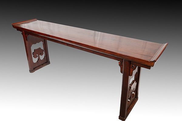 案通体黄花黎木制,两端带翘头,边框内镶独板,夹头榫结构。长牙条贯穿两腿,云纹牙头。腿间镶厚板,当中透雕大朵上翻的灵芝头,坐落在托泥上。两侧案腿有明显的侧角收分。案面、牙条及案腿均采用活榫开合结构,便于搬运及组装。