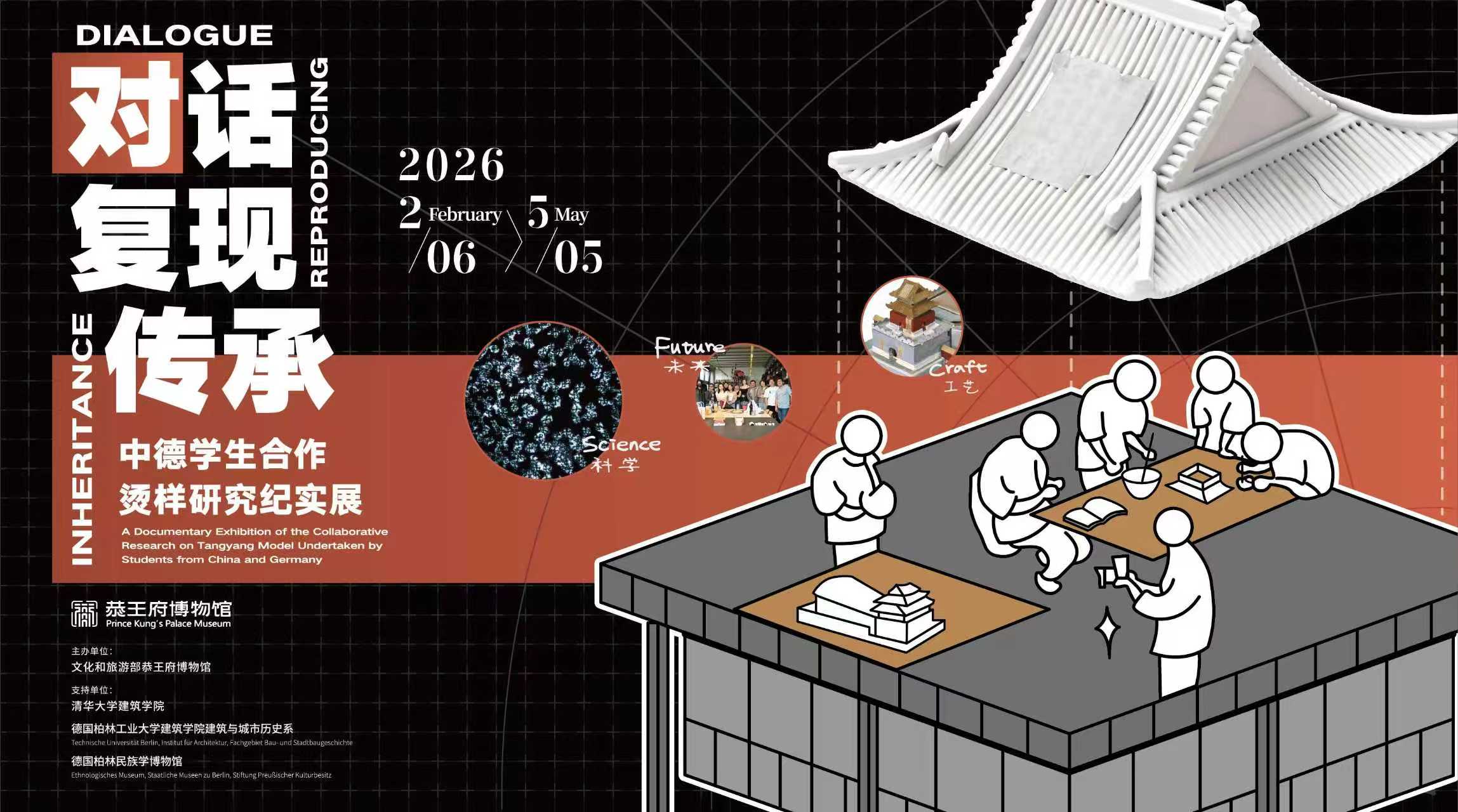展览由恭王府博物馆主办,作为2025年在恭王府博物馆举办的“始作以成——从烫样说起”展的延伸展,展示清华大学建筑学院与柏林工业大学建筑学院师生合作进行烫样研究和复制的过程,尝试在跨文化交流视野下,展现烫样所承载的营建思想和营建技术对当代人的教育启迪作用,凸显中国传统建筑文化在当代的传承延续和创新发展。展览同时也是恭博“我的地盘你做主”策展理念的一次实践,邀请曾作为合作研究团队主要成员的清华大学和柏林工业大学的学生与我馆青年策展人共同策划完成。